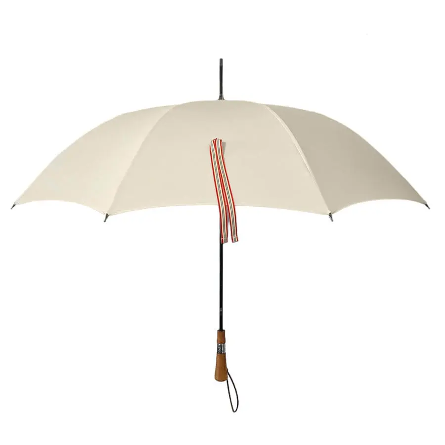 Le premier parapluie issu de cette collection est un antibourrasque écru en toile borgo, sublimé d’une feuille de chêne brodée d’un fil rouge, un symbole apprécié par Ines de la Fressange qui en a fait son emblème dès le lancement de sa marque.